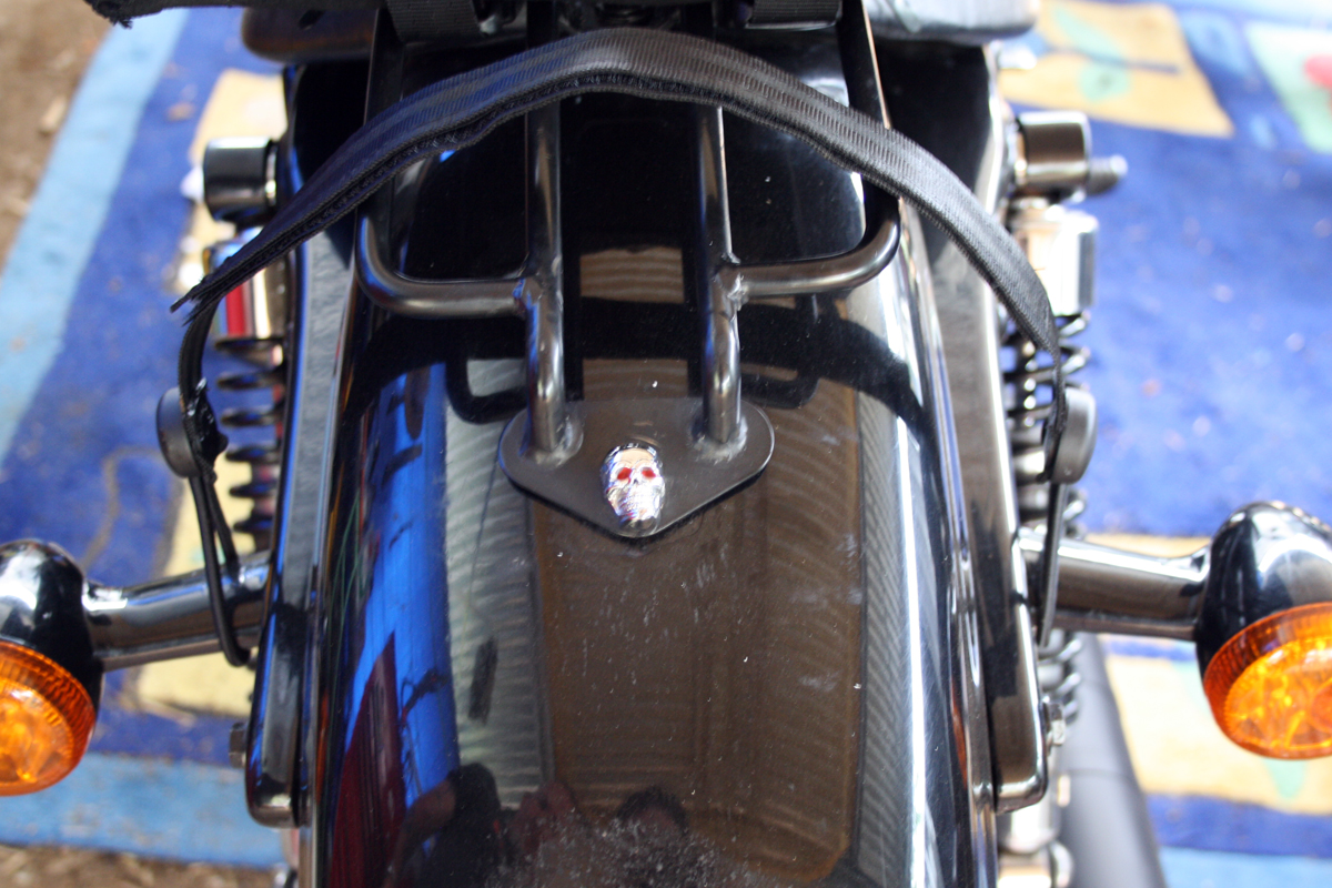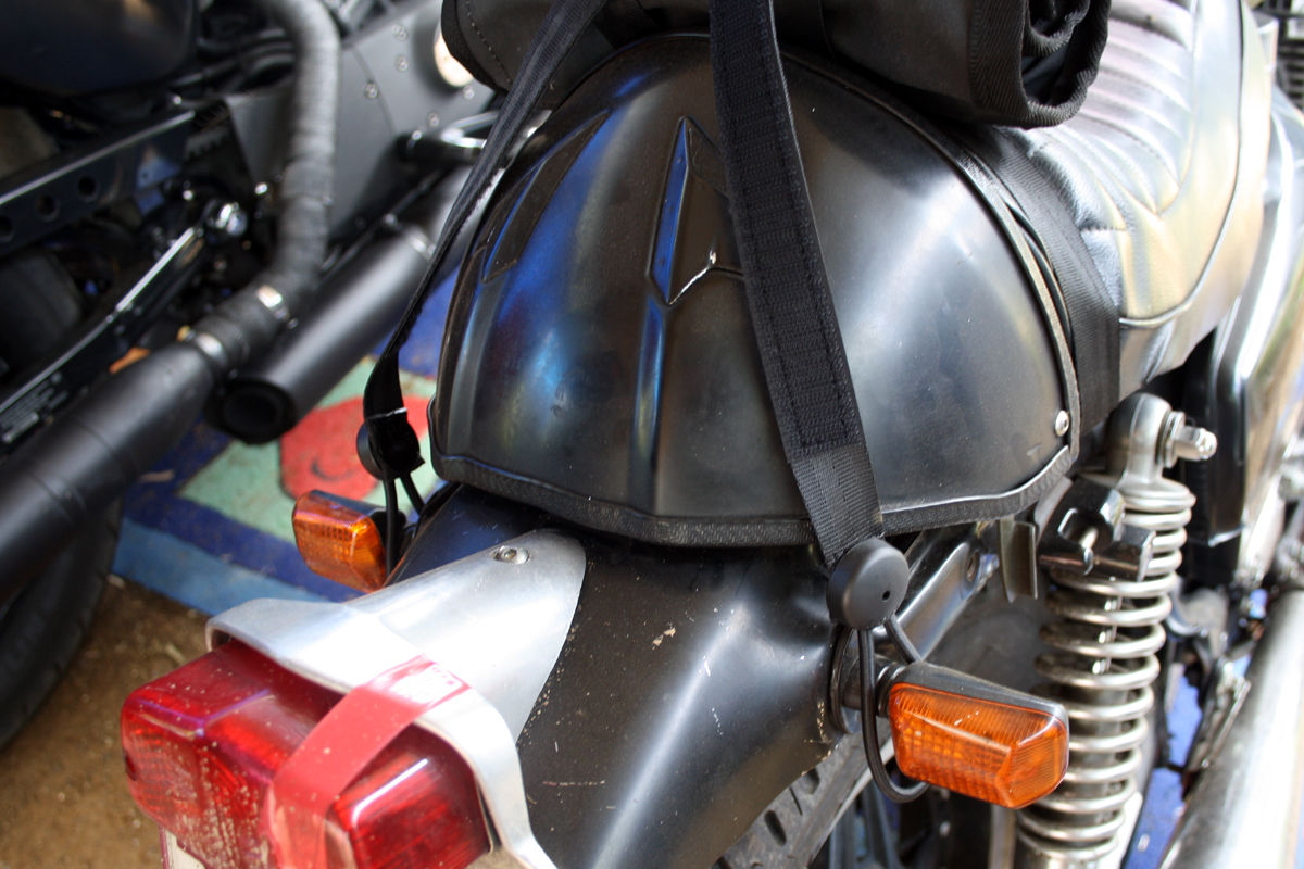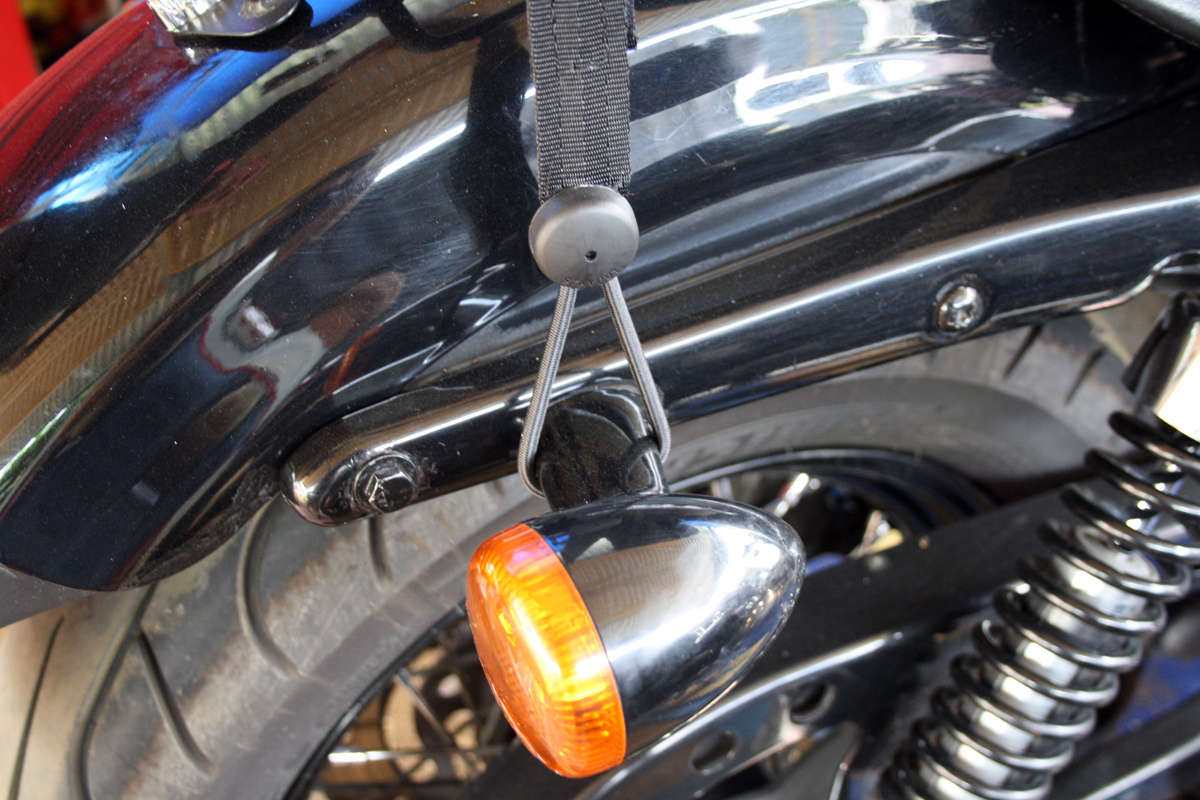 These adjustable straps are tough! Made of seat belt webbing, hook and loop tape and shock cord they offer an amazing alternative to other luggage strapping options. On a bike, such as a cafe racer with no racks, you can put the shock loops around places like indicators, shocky bolts etc. They also come with knobs that can be screwed or riveted to your bike.